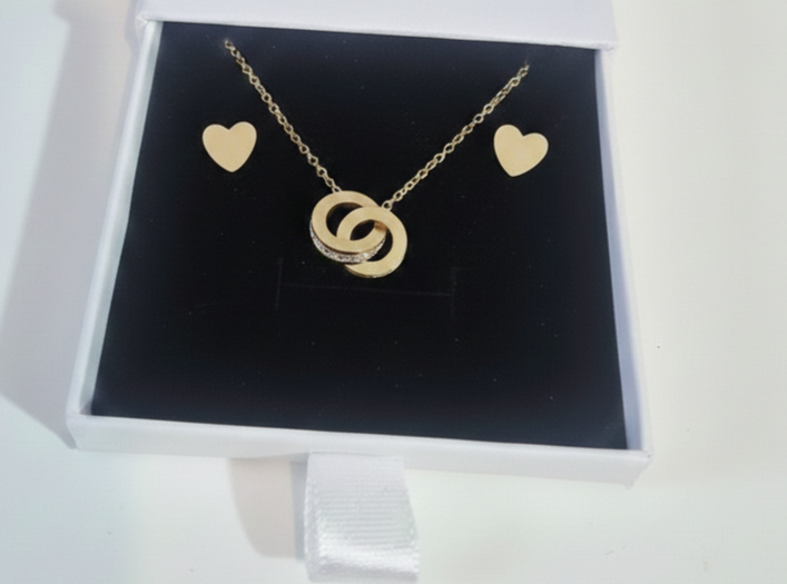 The Golden necklace set includes a necklace and matching earrings, crafted from high-quality, hypoallergenic materials. This set is designed to resist tarnishing and is waterproof, making it suitable for daily wear. Ensure a long-lasting and comfortable accessory that enhances your style while minimizing skin irritation.